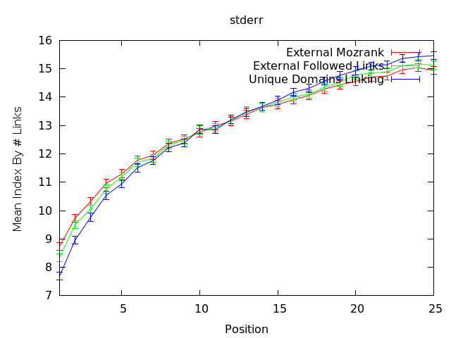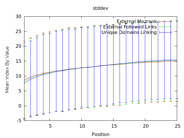 - Mean Index By Value: These are used for the y-axises of many charts. Instead of averaging the raw values, we average it's relative index in the SERP if ordered by this value. So if there are 3 SERPs, and the page in the first position has the 4th most links, the 2nd has the 1st most links, and the 3rd has the 10th most links, the mean index by # of links for the first position would be (4+1+10)/3 = 5.