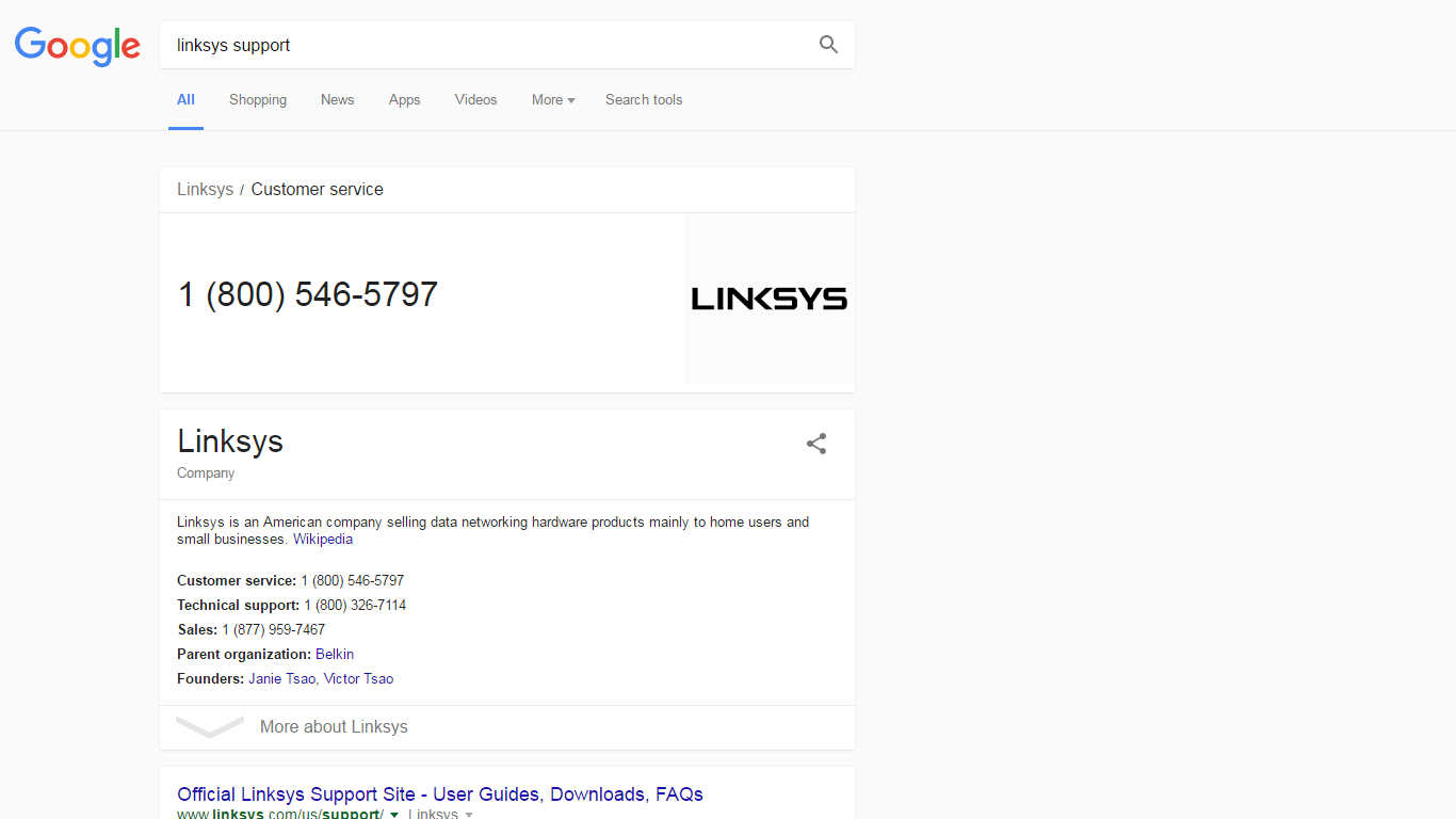 In this case, the Knowledge Card showing the support phone number appears above the Knowledge Panel, and both are above the first organic result. You'll notice some design differences on this example, which was captured in July. Here's another example, with a different, more interesting layout: