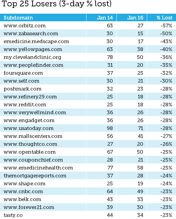 Here are the top 25 winners by % change over the 3 days of the update. The "Jan 14" and "Jan 16" columns represent the total count of rankings (i.e. SERP share) on those days ...