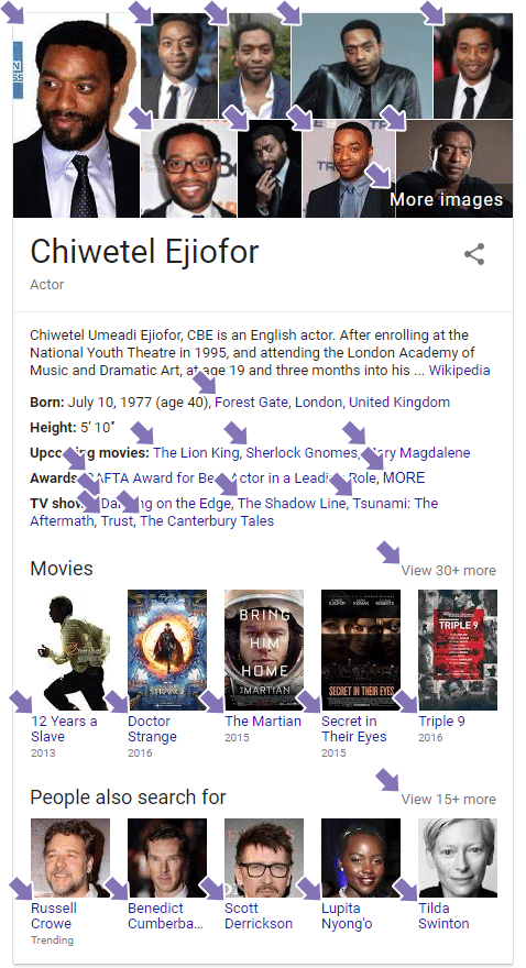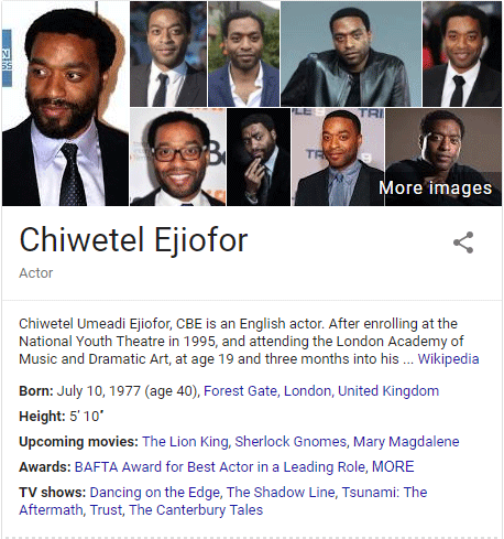 In May of 2012, Google launched the Knowledge Graph. This was Google's first large-scale attempt at providing direct answers in search results, using structured data from trusted sources. One incarnation of the Knowledge Graph is Knowledge Panels, which return rich information about known entities. Here's part of one for actor Chiwetel Ejiofor (note: this image is truncated)...