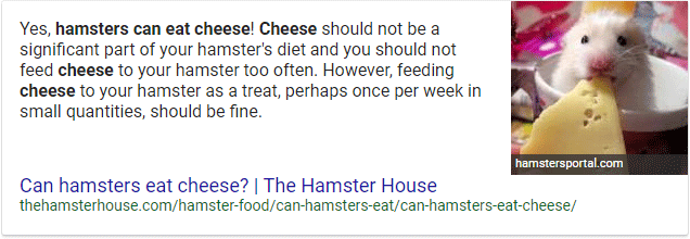 As Google realized that the Knowledge Graph would never scale at the pace of the wider web, they started to extract answers directly from their index (i.e. all of the content in the world, or at least most of it). This led to what they call "Featured Snippets", a special kind of answer box. Here's one for "Can hamsters eat cheese?" (yes, I have a lot of cheese-related questions)...