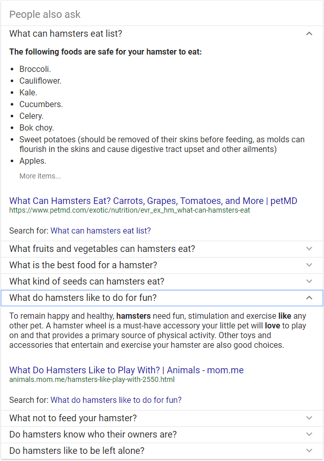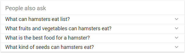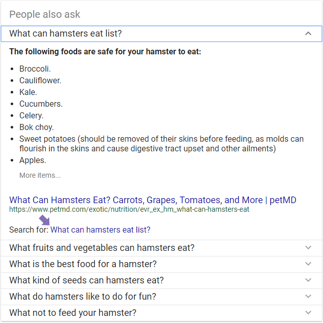 These questions are at least partially machine-generated, which is why the grammar can read a little oddly — that's a fascinating topic for another time. If you click on "What can hamsters eat list?" you get what looks a lot like a Featured Snippet (and links to an outside source)...