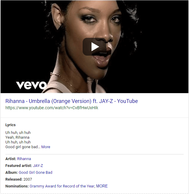 One particularly interesting type of Featured Snippet is the Featured Video result. Search for "umbrella" and you should see a panel like this in the top-left column (truncated):