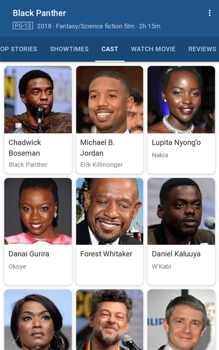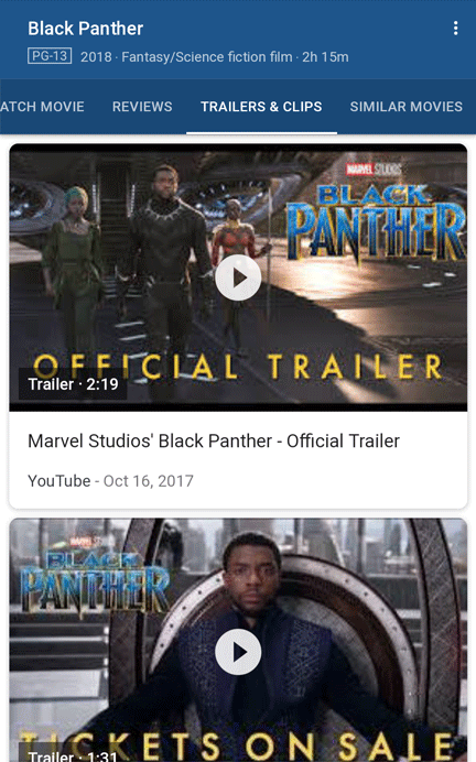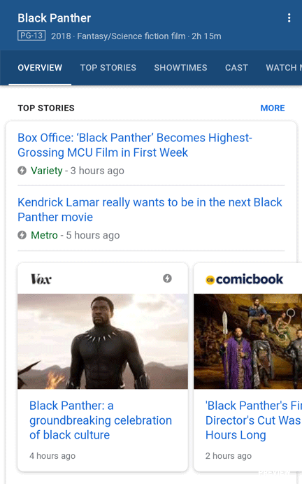 Movie searches yield a rich array of features, from Live Results for local showtimes to rich Knowledge Panels. Last year, Google completely redesigned their mobile experience for movie results, creating a deep in-search experience. Here's a mobile panel for "Black Panther"...