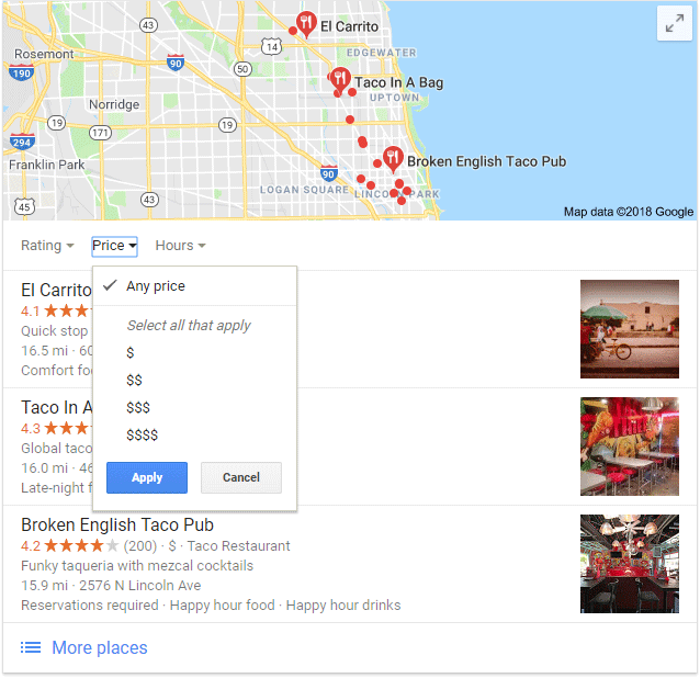 In certain industries, local packs have additional options to run a search within a search. Here's a pack for Chicago taco restaurants, where you can filter results (from the broader set of Google Maps results) by rating, price, or hours...