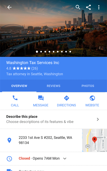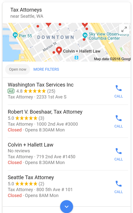 This is an incredible blend of local business result, informational panel, and commercial result, allowing you direct access to booking information. It's not just organic local results that have changed, though. Recently, Google started offering ads in local packs, primarily on mobile results. Here's one for "tax attorneys"...