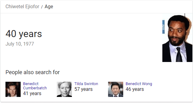 The Knowledge Graph also spawned Knowledge Cards, more broadly known as "answer boxes." Take any fact in the panel above and pose it as a question, and you're likely to get a Knowledge Card. For example, "How old is Chiwetel Ejiofor?" returns the following...