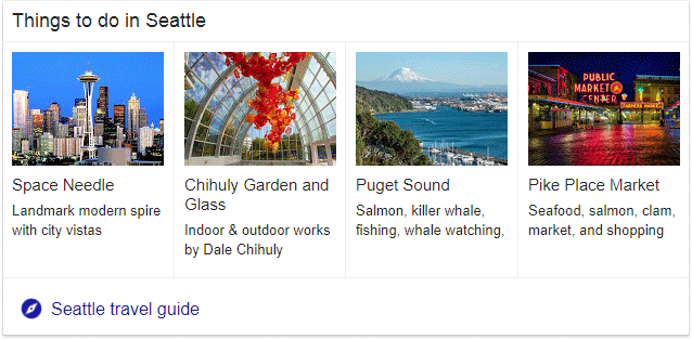 In 2016, Google launched their own travel guides. Run a search like "things to do in Seattle" and you'll see a carousel-style result like this one...