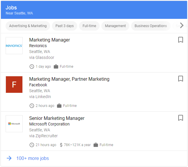 Last year, Google jumped into the job-hunting game, launching a 3-pack of job listings covering all major players in this space, like this one for "marketing jobs in Seattle"...