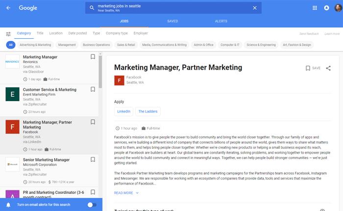 From here, you can view other listings, refine your search, and even save jobs and set up alerts. Once again, you've jumped from a specialized Google result to a completely Google-controlled experience.