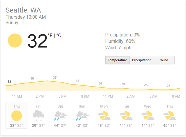 In some specialized cases, Google uses private data partnerships to create customized answer boxes. Google calls these "Live Results." You've probably seen them many times now on weather, sports and stock market searches. Here's one for "Seattle weather"...