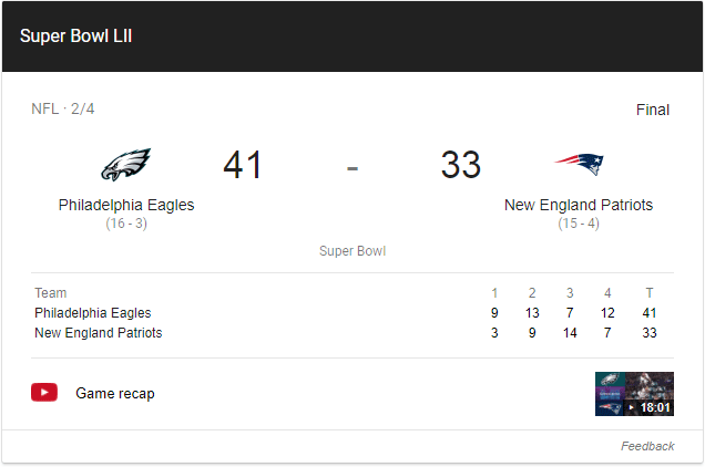 Sports results are incredibly disruptive, and Google has expanded and enriched these results quite a bit over the past couple of years. Here's one for "Super Bowl 2018"...
