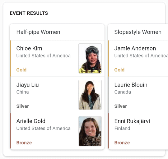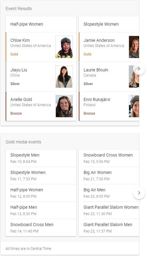 Note that clicking any portion of this Live Result leads to a customized portal on Google that can no longer be called a "search result" in any traditional sense (more on portals later). Special sporting events, such as the 2018 Winter Olympics, have even more rich features. Here are some custom carousels for "Olympic snowboarding results"...