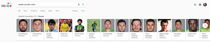 Speaking of carousels, Google has been experimenting with a variety of horizontal result formats, and many of them are built around driving traffic back to Google searches and properties. One of the older styles of carousels is the list format, which runs across the top of desktop searches (above other results). Here's one for "Seattle Sounders roster"...