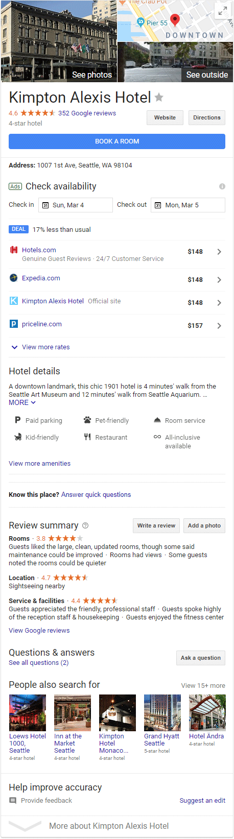 The hospitality industry has been similarly affected. Search for an individual hotel, like "Kimpton Alexis Seattle" (one of my usual haunts when visiting the home office), and you'll get a local panel like the one below. Pardon the long image, but I wanted you to have the full effect...