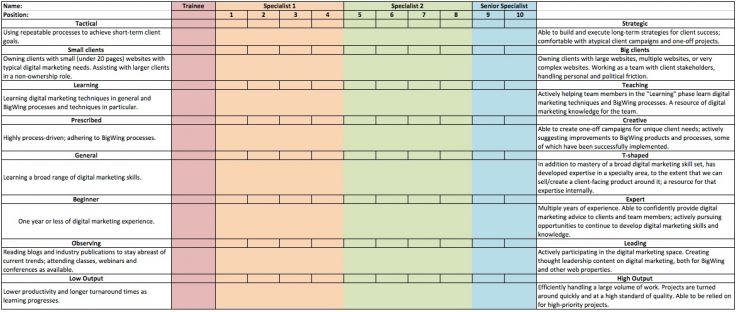 At the beginner level, people are learning digital marketing in general and learning about our specific internal processes. As they gain experience, they become a resource for team members still in the "learning" phase, and at the senior level they should be a go-to for tough questions and expert opinions.