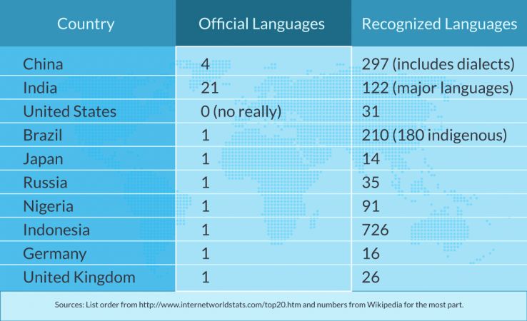 Finally, there is the route I call "hybrid," or utilizing both geo-targeting and translation. This is what most major retail corporations should be doing if they're international. Due to laws, currency, market changes, and cultural changes, there is a big need for geo-targeted content. But in addition to that, there are countries that require multiple language versions. There might be anywhere from one to a few hundred used languages in a single country! Here are the top countries that use the web and how many recognized languages are used in each.