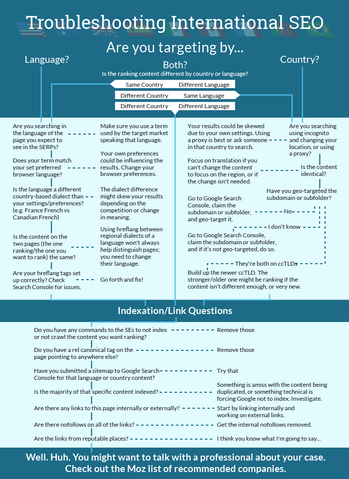 At the end is a bonus! A flow chart to help you troubleshoot international listings showing up in the wrong place in the SERPs. Have you ever wondered why your Canadian page showed for a user in the US? This will help you figure that out!