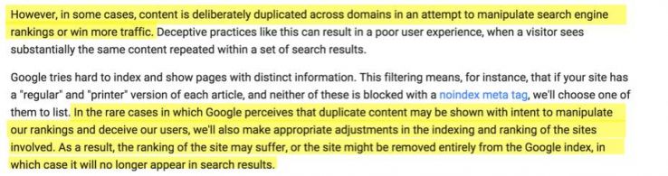 Where duplicate content can get you in trouble is if you are purposely duplicating content in a spammy way in order to manipulate Google. For example, if a huge portion of your site consisted of articles duplicated from other sources, or if you are purposely trying to duplicate content with the intent of manipulating Google, then this can get you a manual penalty and can cause your site to be removed from the Google index: