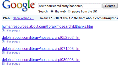 You can see that about.com is clearly disallowing the /library/nosearch/ folder. Yet, here's what happens when we search Google for URLs in that folder: