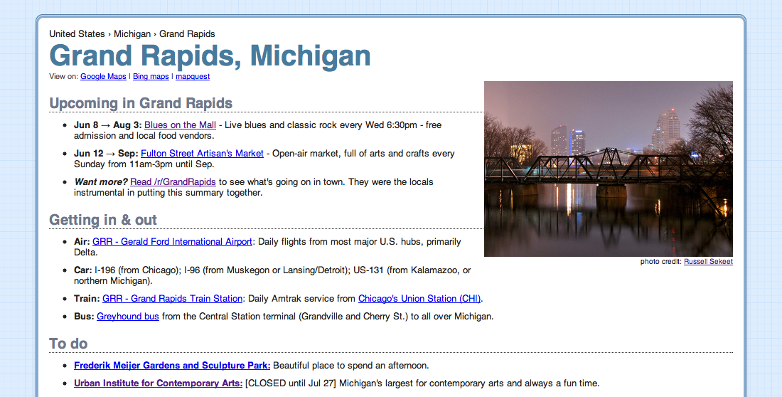 One option to build out this scaleable content is to put together niche destination guides. They already successfully published a Grand Rapids guide (though with a lousy title tag...)