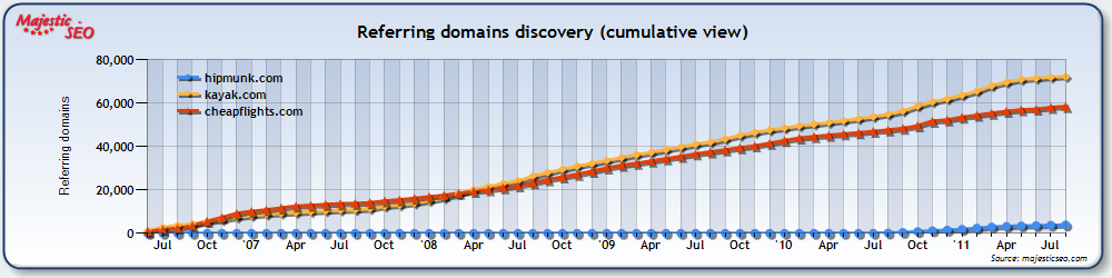 So it seems that Hipmunk don't really need any help link building! Take a look at the following graph (from MajesticSEO) which shows that hipmunk.com is almost gaining as many links per month as the big players like kayak.com and cheapflights.com: