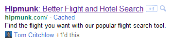 However, there's one trick hidden up that cute little chipmunk's sleeve which is going to play in their favour. In a post-panda world we all know that cute animals as logos make you rank higher. Wait, that's not quite right. What I mean is that in a post-panda world Google is rewarding user engagement. I'm going to hypothesize that user engagement and brand loyalty is off the charts for Hipmunk - based on my own experience and the experience of my friends once you've used it once there's no competition....