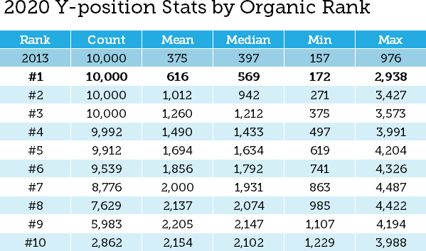 At 2,938px, the 2020 winner comes in at just over three times 2013's worst-case scenario. You may have noticed that the line is slightly above the organic link. For the sake of consistency and to be able to replicate the data later, we chose to use the HTML/CSS container position. This hits about halfway between the organic link and the URL breadcrumbs (which recently moved above the link). This is a slightly more conservative measure than our 2013 study.