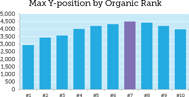Let's dig into that seven-result page-one bucket and look at the worst-case organic position across all of the SERPs in the study, a #7 organic ranking coming in at 4,487px ...