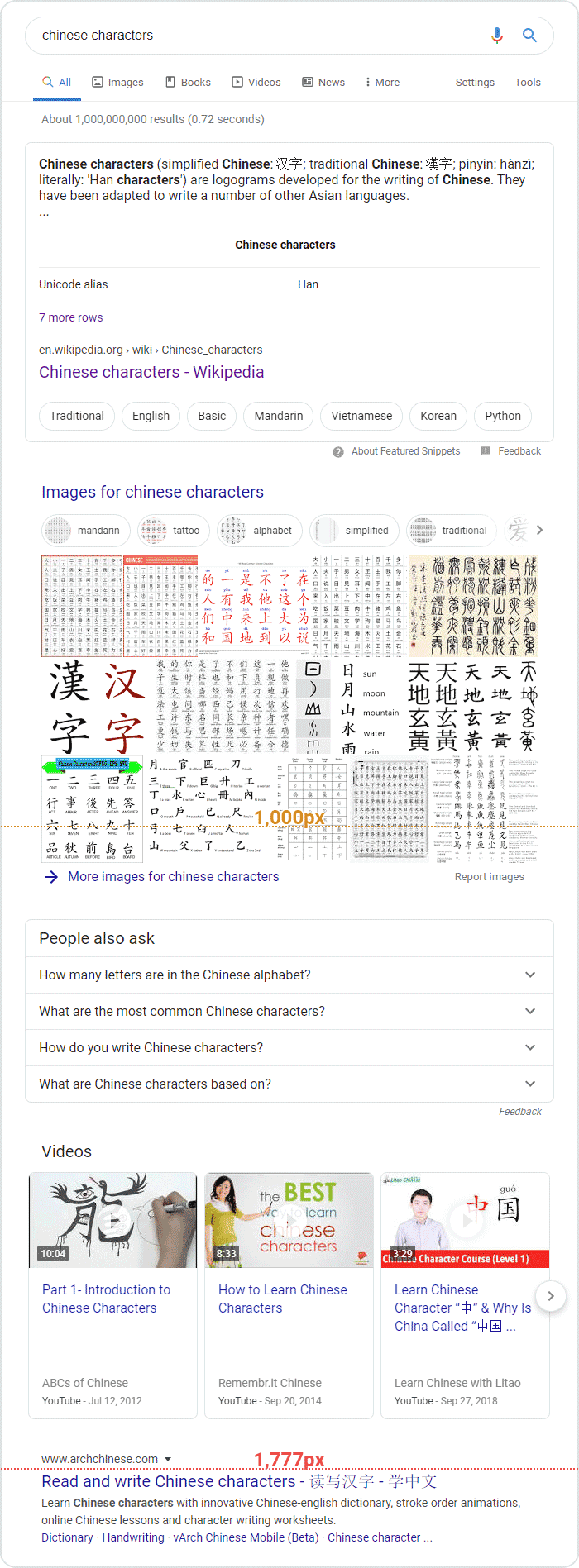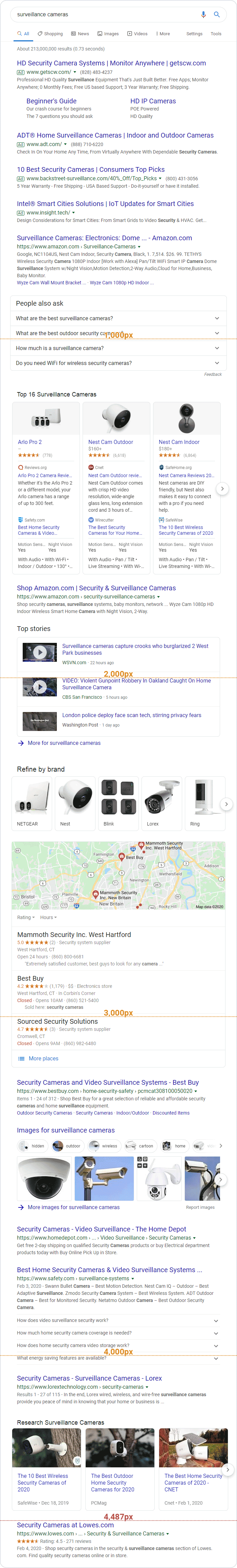 Overall in our study, the average Y-position of #1 results with featured snippets was 99px lower/worse (704px) than traditional #1 results (605px), suggesting a net disadvantage in most cases. In some cases, multiple SERP features can appear between the featured snippet and the #2 organic result. Here's an example where the #1 and #2 result are 1,342px apart ...