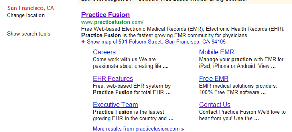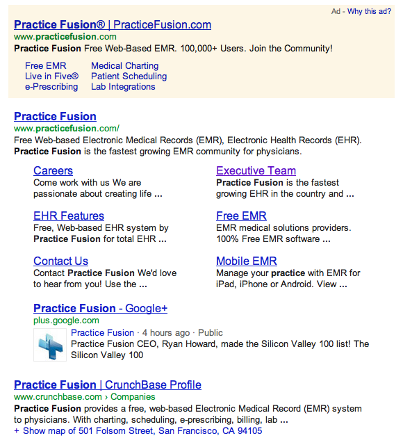 Here’s what my non-personalized search for Practice Fusion pulled up in position #1: