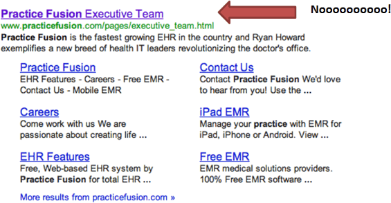 Do you see what I see?! Ranking #1 for the term Practice Fusion isn’t our high-converting, very helpful homepage….it’s our rarely looked at, poor converting Executive Team page! OMG to the extreme! Plus, where the heck did our Google+ page go?