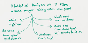 In this case, that could be, "Well, you know what? We can do a statistical analysis." We get a sample set big enough, enough films, maybe 150 movies or so from the last year. We take a look at the ratings that each service provides, and we see if we can find patterns, patterns like: Who's high and low? Do some have different genre preferences? Which one is trustworthy? Does one correlate with awards and critics? Which ones are outliers? All of these are actually trying to get to the "which one can I trust" question.