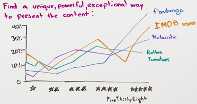 They took this statistical analysis. They looked at all of these different sites, Fandango and IMDB users versus critics versus Metacritic versus Rotten Tomatoes and a number of other sites. Then they had this one graph that shows essentially the star rating averages across I think it was 146 different films, which was the sample set that they determined was accurate enough.