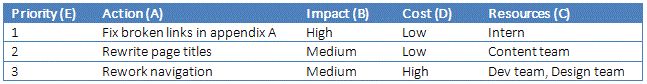 If you spend a few hours on any SEO blog, you'll learn all about how to review a website, identify SEO problems, and propose solutions. But proposing solutions alone doesn't get them fixed. Clients and managers will be much more likely to implement your recommendations if you propose clear, concrete action plans that prioritize steps based on expected cost and benefit. It's helpful to include a spreadsheet at the end of each audit that looks something like this: