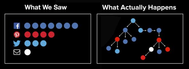 Basically, people jump between social networks and links and back again. For example, a Facebook Like might lead to a Facebook Share that leads to a Twitter Share that bounces to a website via a link then back to Facebook as a Like or Share.
