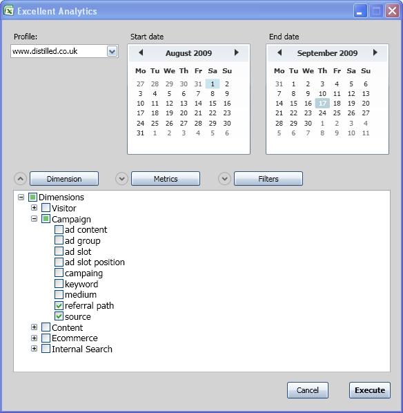 I'm glad you asked. Basically what it does is it provides a GUI (graphical user interface) for querying the Google Analytics API. You'll need to give it your username and password and then you'll be presented with a list of Metrics and Dimensions (just like building a custom report in Google Analytics) that you can choose to include or exclude. Excellent Analyics then pulls the data you've requested over the date range you've given it into the Excel sheet you're working on. Nifty. But rather than bore you with hypothetical examples and generic screenshots let me walk you through a real-life example that I used it for only a few days ago.Example - How To Get A Full List of Referring Pages