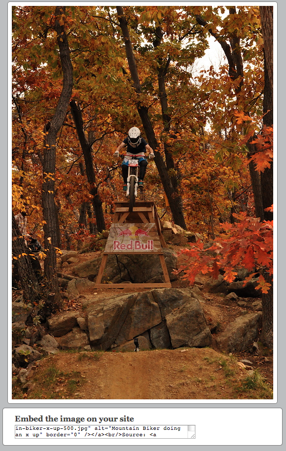 Like videos, photos are shared frequently; the catch is that most sites that host their own videos offer you the ability to embed the video. Most sites that offer photo galleries don’t offer this option. Sites like Pink Bike could stand to benefit from this by having code to “embed this image” below the photo with a couple different sizing options. This is applicable to any site, not just sites offering galleries; if you allow users to upload images to a forum or for a review, you should enable and encourage users to embed the image. Rand did a great Whiteboard Friday on Linkbuilding Through Embedded Content. There are so many opportunities to leverage embedded content, most sites could find a way to build links through embedding content. This is an example of how photo galleries should incorporate this: