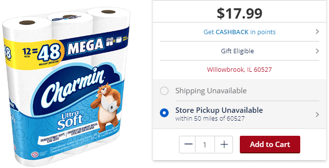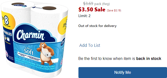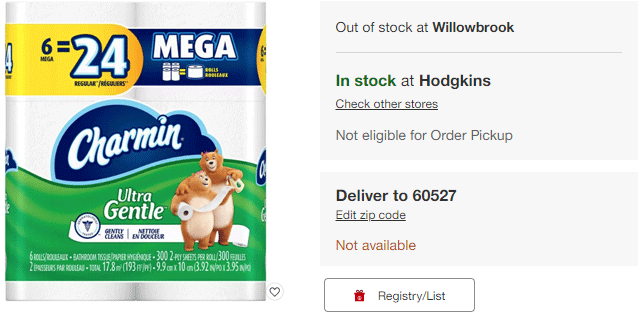 The product is out of stock at my local store and not available for delivery, but it is available at a nearby store. That's not ideal, and under normal circumstances I'd probably go somewhere else, but in the current environment it's at least a viable option. A viable option is a potential sale.