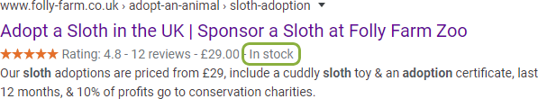 Good news — sloths are still in stock. Unfortunately, there are two challenges to this approach. First, while searchers may appreciate your honesty, you may not be keen to display "Out of stock" on your search result when everyone else is displaying nothing at all. Second, we've still got the timing issue. You can automate flipping from "In stock" to "Out of stock" in real time, but Google still has to crawl and update that information, and that takes time.