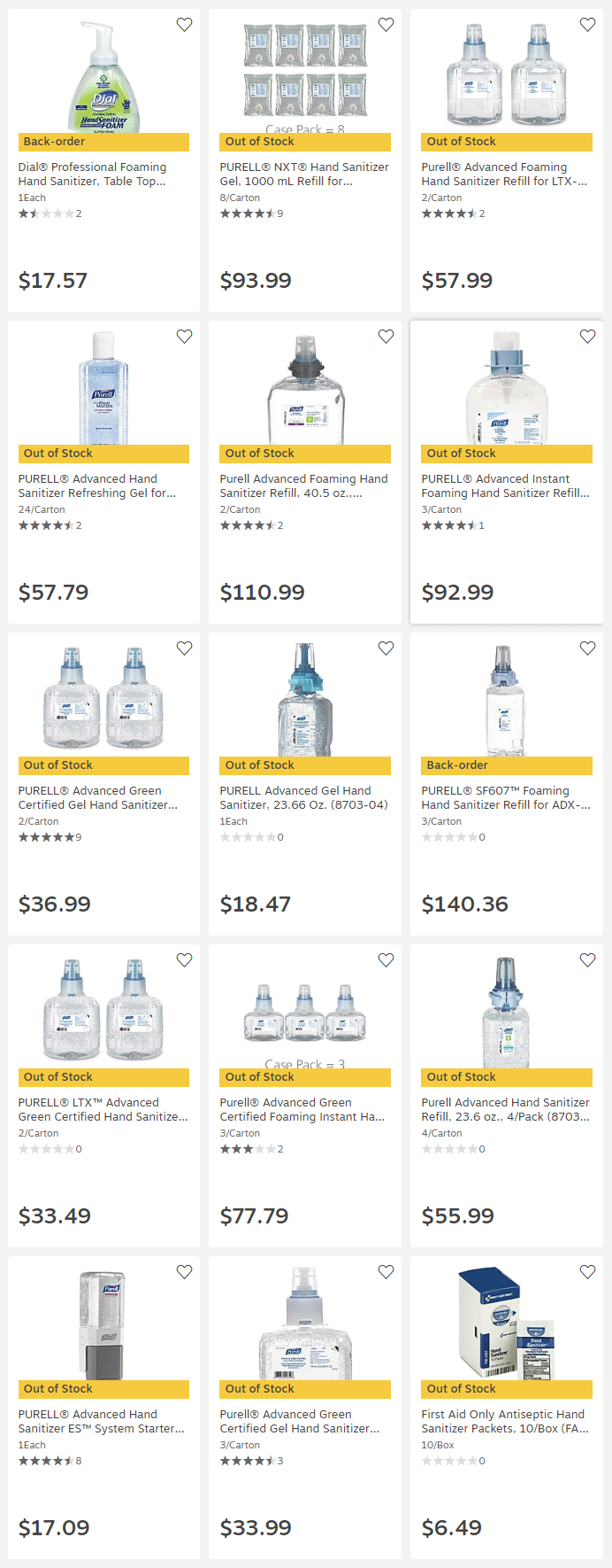These are hand sanitizer results from Staples.com, and this screenshot is just a portion of the first page. I'm not picking on Staples — this page is representative of a problem across every major e-retailer right now. While there are many ways to handle out-of-stock and discontinued items under normal conditions, this situation is very specific: