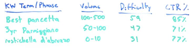 So first, build a keyword research list. You can use Moz's Keyword Explorer, which is what I personally use. But there are many keyword research tools out there on the web. You can type in phrases. I love Italian food, so I'm using examples like that, so "best pancetta," "3-year aged parmigiano," "Rustichella d'Abruzzo," which is like this pasta variety that I personally think is the best one out there. There's search volume, there's difficulty, and there's click-through rate percentages. So I'm building this list. You can go check out the videos on keyword research if you want to dive deeper on this.