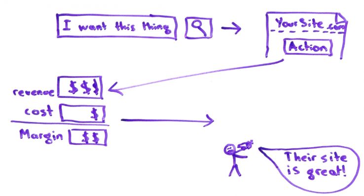 So you want to find people who are searching for a variety of things. I want this thing. Do a search. Come to your site. Take an action of some kind. That could be sign up for an email list. It could be view some advertising. It could be actually buy a physical product or buy a software product, whatever it is. You make revenue that is significantly more than the cost of serving that customer, the cost to you of maintaining the website, doing the marketing, your time and hours and whoever else you employ, keeping the lights on, paying the bills and the taxes, and the product itself, whatever you're shipping or whatever you're creating and serving, software, advertising, etc.