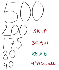 I went a little bit further with my study, and I asked those same people: Why is it that you don't read? How is it that there are such low numbers for the people who actually read? The answer was, "Well, I just skip stuff." "I don't have time for reading." "I mainly scan," or, "I read everything." That was 80 out of 500 people. The rest said, "I just read the headline and move on," which was amazing to hear.