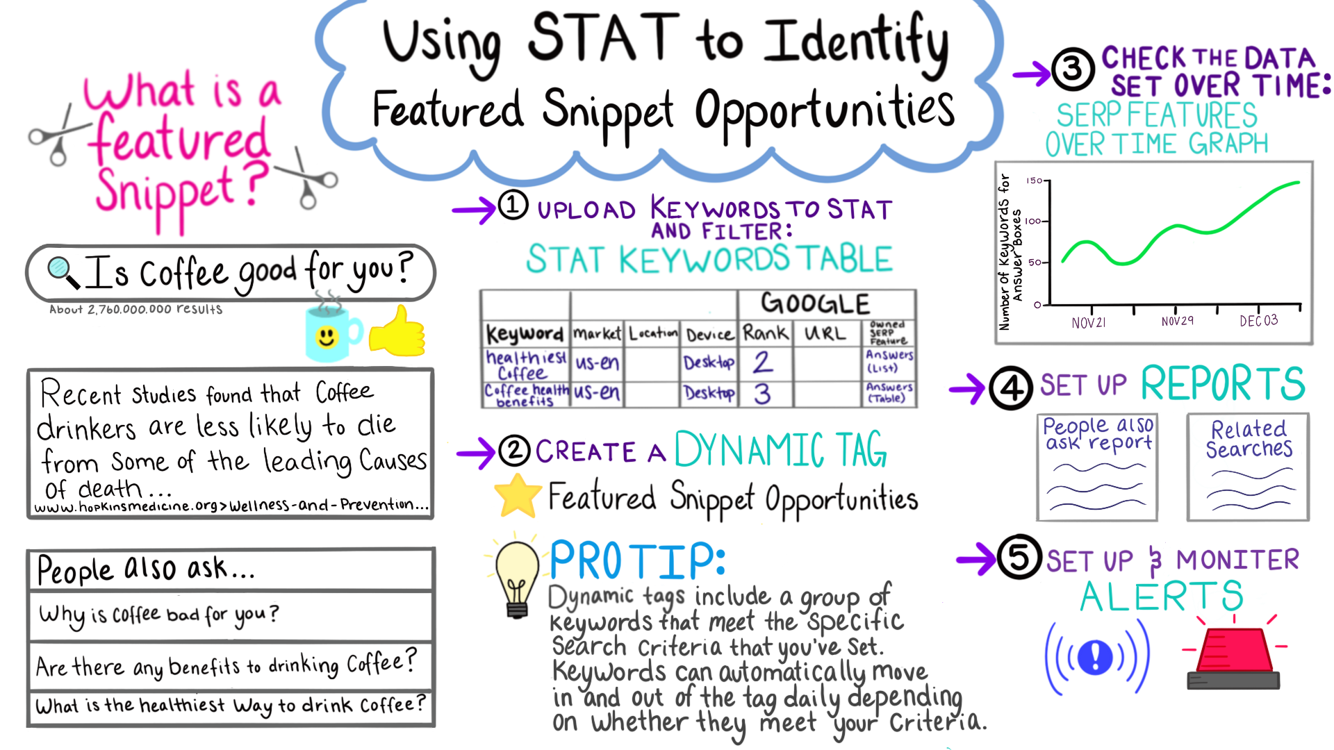 I recommend setting up alerts for this. STAT lets you do this so you'll be notified any time your ranking goes up or down for your featured snippet target keywords, meaning you're not going to miss seeing an opportunity. I hope this has been helpful and you're feeling more prepared to try some of this.