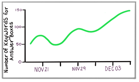 Taking a look at STAT's SERP Features tab can help out here. There's a nifty graph which allows you to see how answer boxes appear if your keywords have changed over time. Using this will help you to access opportunity. You can then start pulling out and comparing some of that data and digging into things like average monthly search volume, current featured snippet URLs, and the featured snippet type.