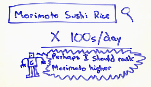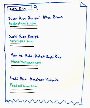 I'll give you an example. I've done a search here for sushi rice. You can see there's Alton Brown ranking number one, and then norecipes.com, makemysushi.com, and then Morimoto. Morimoto's recipe is in Food & Wine. If lots and lots of folks are starting to say like, "Wow, Morimoto sushi rice is just incredible," and it kind of starts up this movement around, "How do we recreate Morimoto sushi rice," so many, many people are performing searches specifically for Morimoto sushi rice, not just generic sushi rice, Google might start to see that and say, "You know what? Because I see that hundreds of people a day are searching for this particular brand, the Morimoto sushi rice recipe, maybe I should take the result from Morimoto on foodandwine.com and move that higher up in the rankings than I normally would have them."