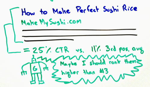 This is from makemysushi.com. Let's imagine that the normal in this set of search results that, on average, the position three result gets about 11%, but Google is seeing that these guys makemysushi.com is getting a 25% click-through rate, much higher than their normal 11%. Well, Google might kind of scratch their head and go, "You know what? It seems like whatever the snippet is here or the title, the domain, the meta description, whatever is showing here, is really interesting folks. So perhaps we should rank them higher than they rank today."