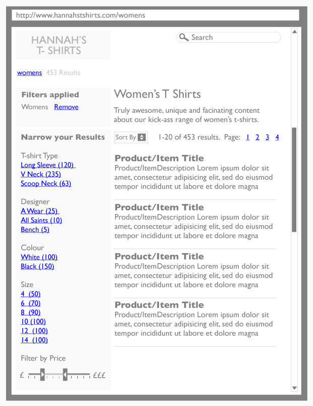 This is really linked to the previous two points. Again using the example above – if your facets were Womens, T-Shirt Type and Designer; but you had a burning desire to rank for the term ‘white women’s t-shirts’ – then bad news, friend. As colour is a filter rather than a facet you don’t have an indexable page for that phrase. If you want to rank for these sorts of keywords you’ll need to make colour a facet, not a filter.