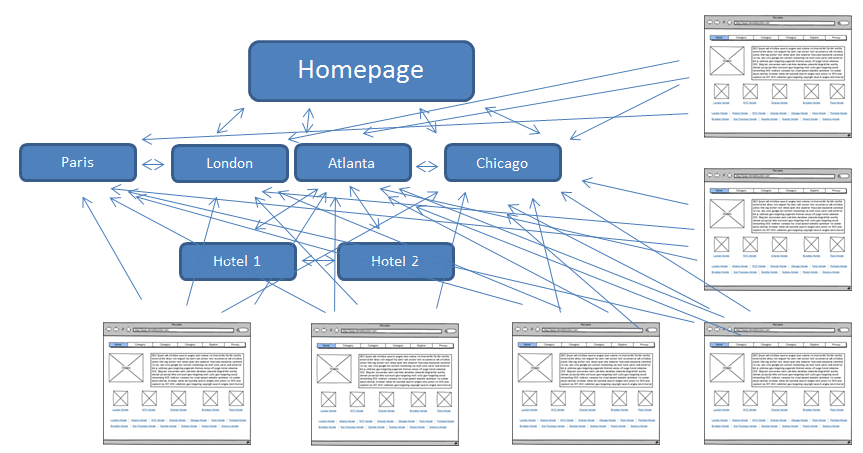 When you take this out to scale, the linking between the sites (and all of the links shown in the microsite example are sitewide) begins to look thus: